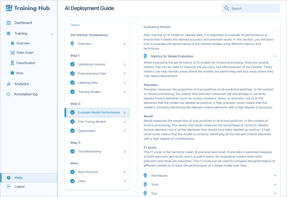 As users are my first concern, I decided to design a coherent training process in early iterations. Following several brainstorming sessions, I explored various methods of guiding users through the training process, such as adding steps, guide sections, guide pages, lots of tips, and navigation bars.