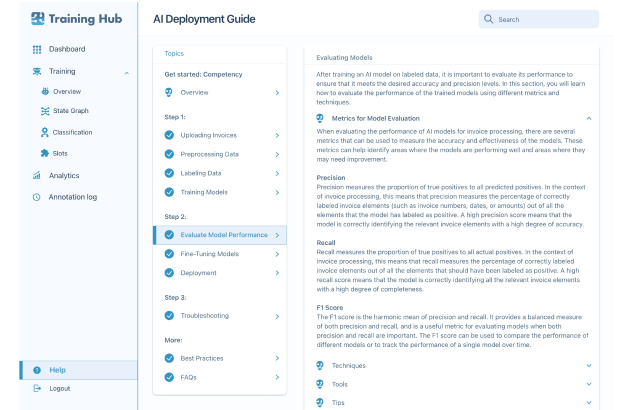 After careful consideration, I decided to develop a training guide page with a dedicated work area. This approach allows users to navigate the iterative training process without the need to switch between multiple pages, thus minimizing any potential disruptions to their learning experience.