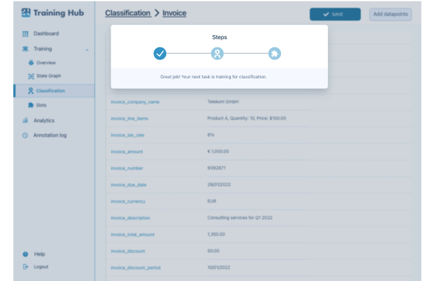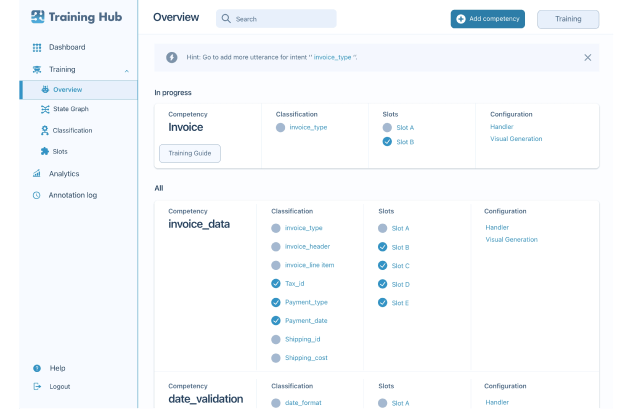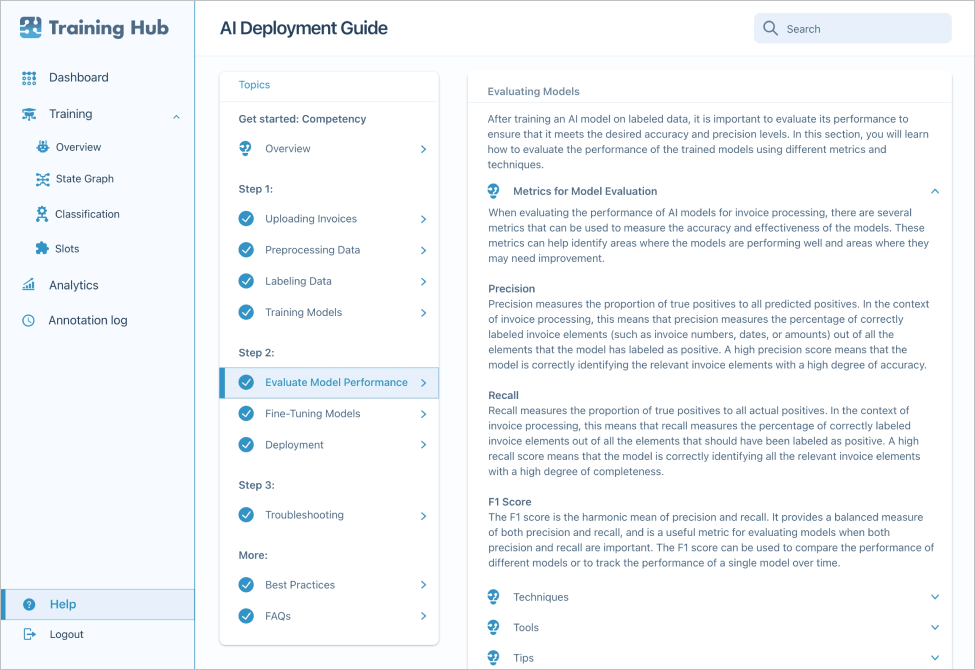Designed a focused training guide page with a persistent work area. This eliminated excessive page switching and supported continuous, iterative model refinement. The interface reinforced progression, reducing ambiguity in what to do next and where users stood in the lifecycle.